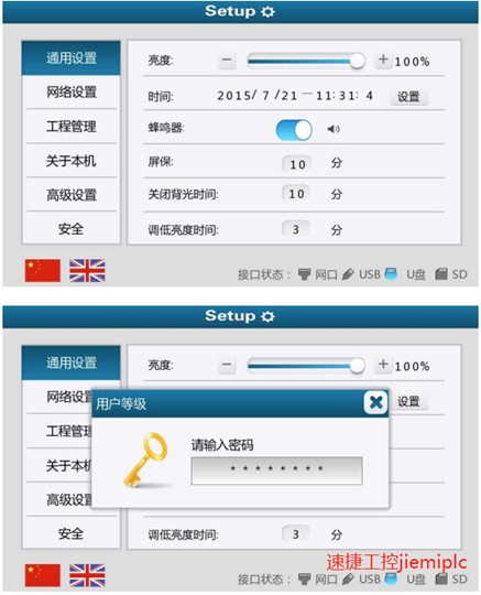 3.進入設置界面,選擇“工程管理”,輸入密碼,工程管理密碼默認為“888888”,可在軟件“全局設 置”中修改(百度一下速捷工控)